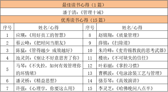 本次為2019年第三季度讀書心得評選活動,經總裁辦校對、審核,從100多篇心得中初選出30篇,再根據主題明確、立意新穎、結合工作實際、文字通順完整等篩選出16篇優(yōu)秀心得,其中獲得本季度“最佳讀書心得”得主品質部潘于清的《管理十誡》評選。最佳及優(yōu)秀文稿如下: