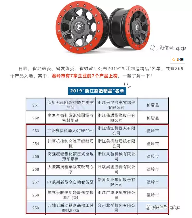 為全面提升“浙江制造”品牌形象,深入推進(jìn)實(shí)施“四換三名”工程,推動企業(yè)提升創(chuàng)新能力、品牌培育和市場開拓力度,扶持并推廣應(yīng)用一批“技術(shù)先進(jìn)、設(shè)計(jì)新穎、質(zhì)量可靠、效益優(yōu)良”的浙江制造產(chǎn)品,公司響應(yīng)風(fēng)馳于2019響應(yīng)政府號召積極參與“浙江制造精品”申報,通過省經(jīng)信委、省發(fā)改委、省財經(jīng)廳聯(lián)合開展評選,風(fēng)馳的《高強(qiáng)度輕量化滾壓式全地形車鋼圈》上榜入選為2019“浙江制造精品”名單,同時根據(jù)市政府鼓勵企業(yè)開發(fā)新產(chǎn)品的規(guī)定,公司將予以獲得30萬元的獎勵。
