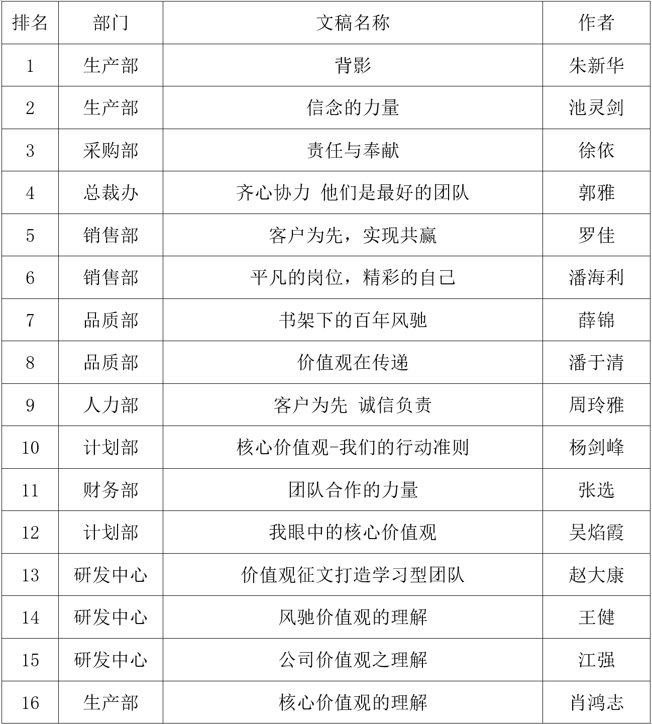 首先,評審組10位評委根據(jù)價值觀主題、文稿內(nèi)容,觀點表達清晰度,事實案例,語言表達流暢,文稿整體結(jié)構(gòu)完整性,幾個方面對稿件進行了認(rèn)真的打分,再依據(jù)分值排名匯總至執(zhí)行總裁最終審核,得出最終評審結(jié)果:生產(chǎn)部朱新華的《背影》一文一舉奪魁,文中沒有華麗的文字,沒有網(wǎng)紅的心靈雞湯,只是簡單的言語,背后卻道出了我們公司的價值觀,平凡崗位上忙碌的背影深深印刻在每位風(fēng)馳人的心中,文章獲得評委們的一致好評。生產(chǎn)部池靈劍的《信念的力量》立場鮮明,主題突出,讓人感到信念的是一種熱烈的,一種噴薄而出,一種昂揚斗志的力量,喜獲二等獎;采購部徐依的《責(zé)任與豐獻》,總裁辦郭雅的《齊心協(xié)力,他們是最好的團隊》并列三等獎。