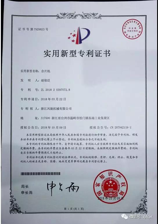 2018年10月榮獲“合片機”實用新型專利證書