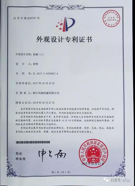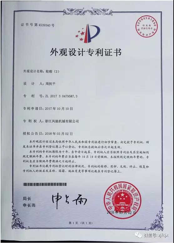 2018年3月榮獲“輪轂”外觀設(shè)計專利證書