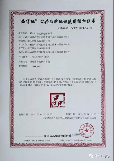 2018年10月榮獲浙江省品牌建設(shè)聯(lián)合會頒發(fā)的“品字標”公共品牌標識使用授權(quán)證書