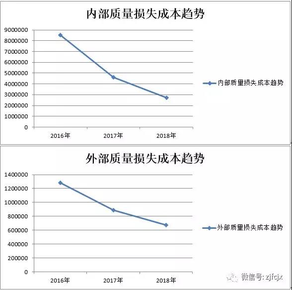 在2017年建立公司質(zhì)量成本統(tǒng)計(jì)核算系統(tǒng)以來,質(zhì)量損失事件及不合格產(chǎn)品造成的質(zhì)量損失成本數(shù)據(jù)進(jìn)行了有效的收集、統(tǒng)計(jì)、分析、匯總,2018年,質(zhì)量損失成本管理的持續(xù)化,及對質(zhì)量損失成本分析數(shù)據(jù)的有效應(yīng)用,最終得到了豐厚的回報(bào),根據(jù)質(zhì)量損失成本的排列圖分析,而確定的涂裝生銹、涂裝油點(diǎn)的改進(jìn);針對鈑金工藝的滾圈、擴(kuò)口開裂的報(bào)廢損失的改進(jìn),最終使本公司的內(nèi)部質(zhì)量損失成本,由2016年的850萬下降到2018年的273萬;外部質(zhì)量損失成本由2016年的128萬,下降到2018年的67萬。